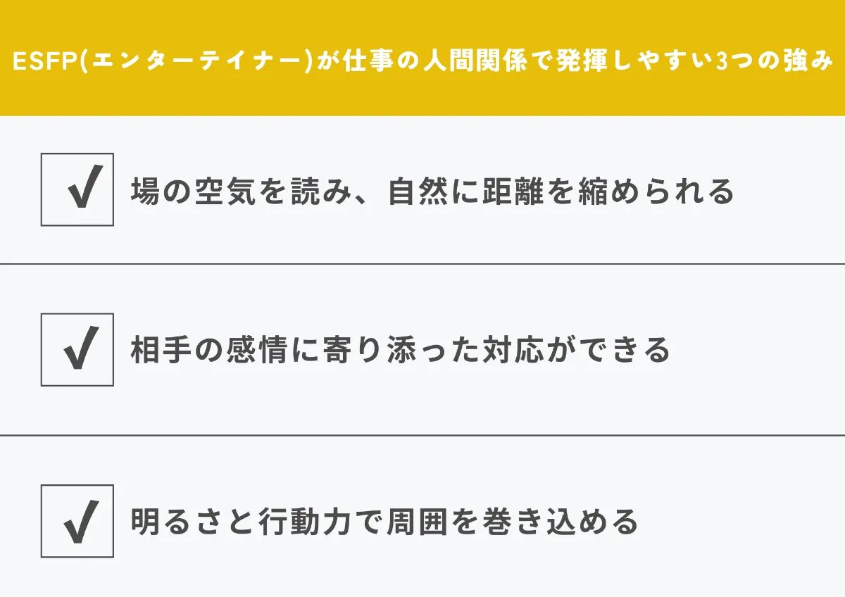 つまりESFPは、分析型の優等生というより、人を動かす現場型の実力者です。